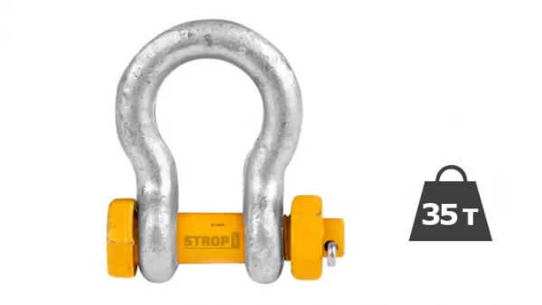Скоба такелажна типу G2130 вантажопідйомністю 35 тон виготовлена з високоміцної сталі, має оцинковане покриття, коефіцієнт запасу міцності 6:1 та відповідає стандарту ДСТУ EN 13889:2014.